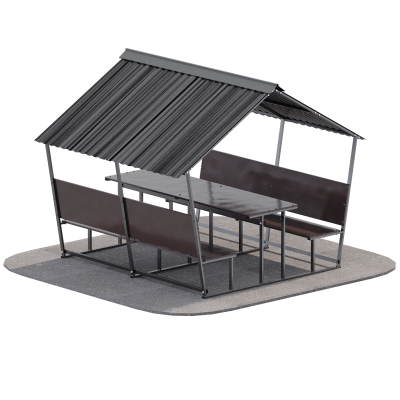 Крыша выполнена из профнастила, который эффективно защищает от дождя и солнечных лучей. Профилированный лист обладает высокой жёсткостью, устойчив к механическим нагрузкам и отличается долговечностью при использовании на открытом воздухе.