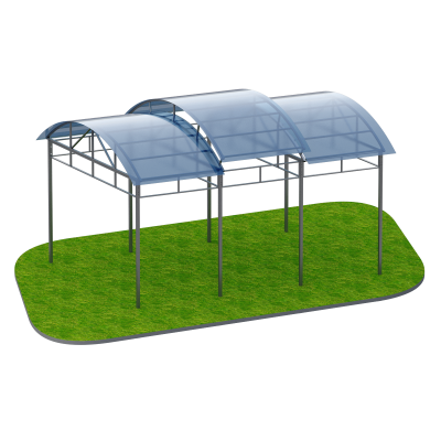 Крыша навеса выполнена из сотового поликарбоната толщиной 6 мм. Этот материал обладает высокой устойчивостью к атмосферным воздействиям, ультрафиолетовому излучению и механическим нагрузкам. Поликарбонат хорошо пропускает свет, создавая комфортную освещенность под навесом и одновременно защищая пользователей от перегрева.
