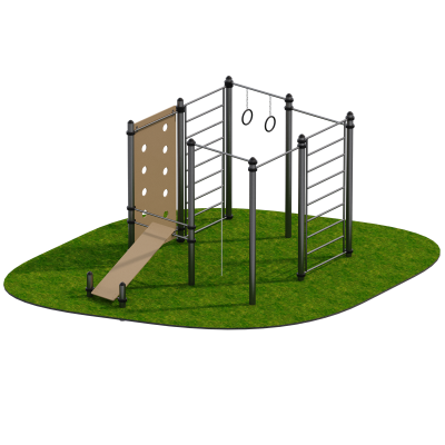 Лежак и стенка из влагостойкой фанеры обеспечивают возможность выполнения упражнений на пресс, подъёмов корпуса, статических удержаний и элементов растяжки. Комплекс подходит для установки в образовательных учреждениях, военных частях и общественных воркаут-зонах, где требуется универсальное и надёжное оборудование.